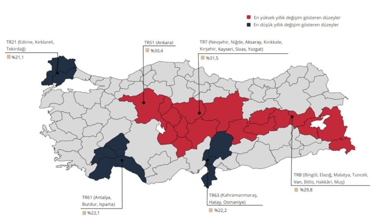 En düşük yıllık artış ise yüzde 21,1 ile Edirne, Kırklareli ve Tekirdağ bölgesinde kaydedildi.