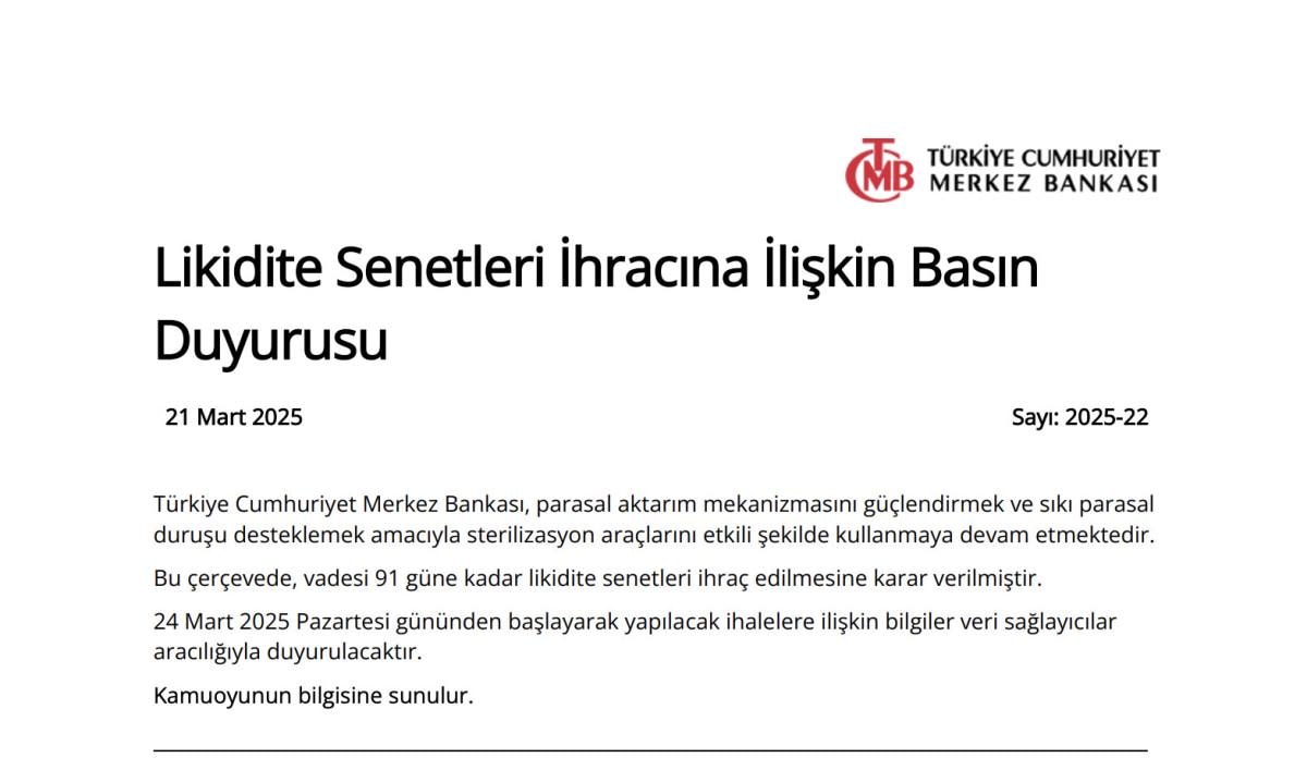 Bu çerçevede, vadesi 91 güne kadar likidite senetleri ihraç edilmesine karar verildiği aktarılan duyuruda, "24 Mart 2025 Pazartesi gününden başlayarak yapılacak ihalelere ilişkin bilgiler veri sağlayıcılar aracılığıyla duyurulacaktır." ifadesine yer verildi.