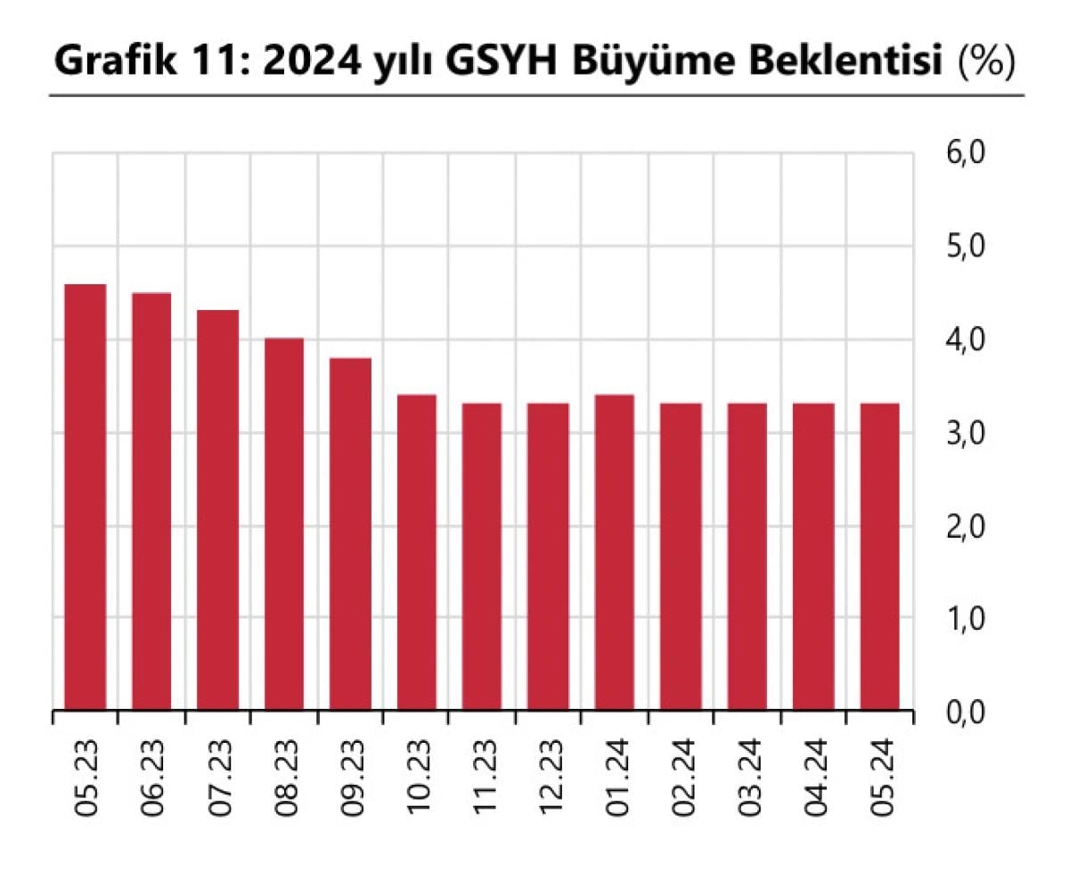 Katılımcıların GSYH 2024 yılı ve 2025 yılı büyüme beklentileri, bir önceki anket döneminde olduğu gibi bu anket döneminde de sırasıyla yüzde 3,3 ve 3,7 olarak gerçekleşti.