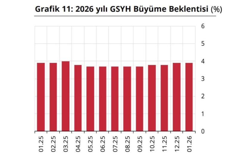 Katılımcıların GSYH 2026 yılı büyüme beklentisi bir önceki anket döneminde olduğu gibi bu anket döneminde de yüzde 3,9 olarak gerçekleşti. GSYH, 2027 yılı büyüme beklentisi bu anket döneminde yüzde 4,3 oldu.