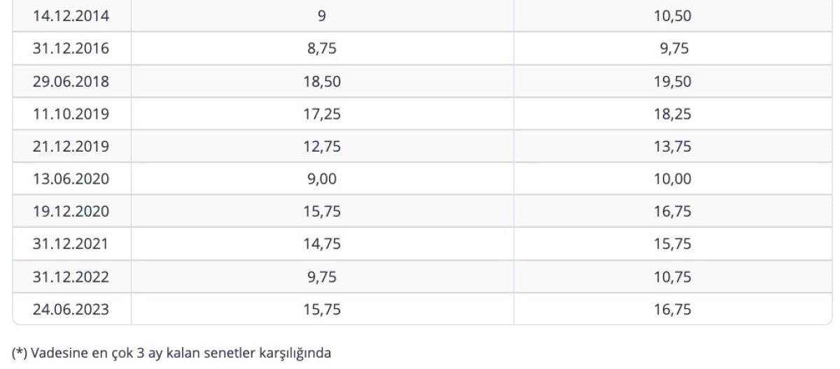 Söz konusu oranlar bugün itibarıyla yürürlüğe girerken, bu oranlar daha önce reeskont iskonto faizi için yüzde 15,75 ve avans işlemleri için yüzde 16,75 düzeyinde bulunuyordu.