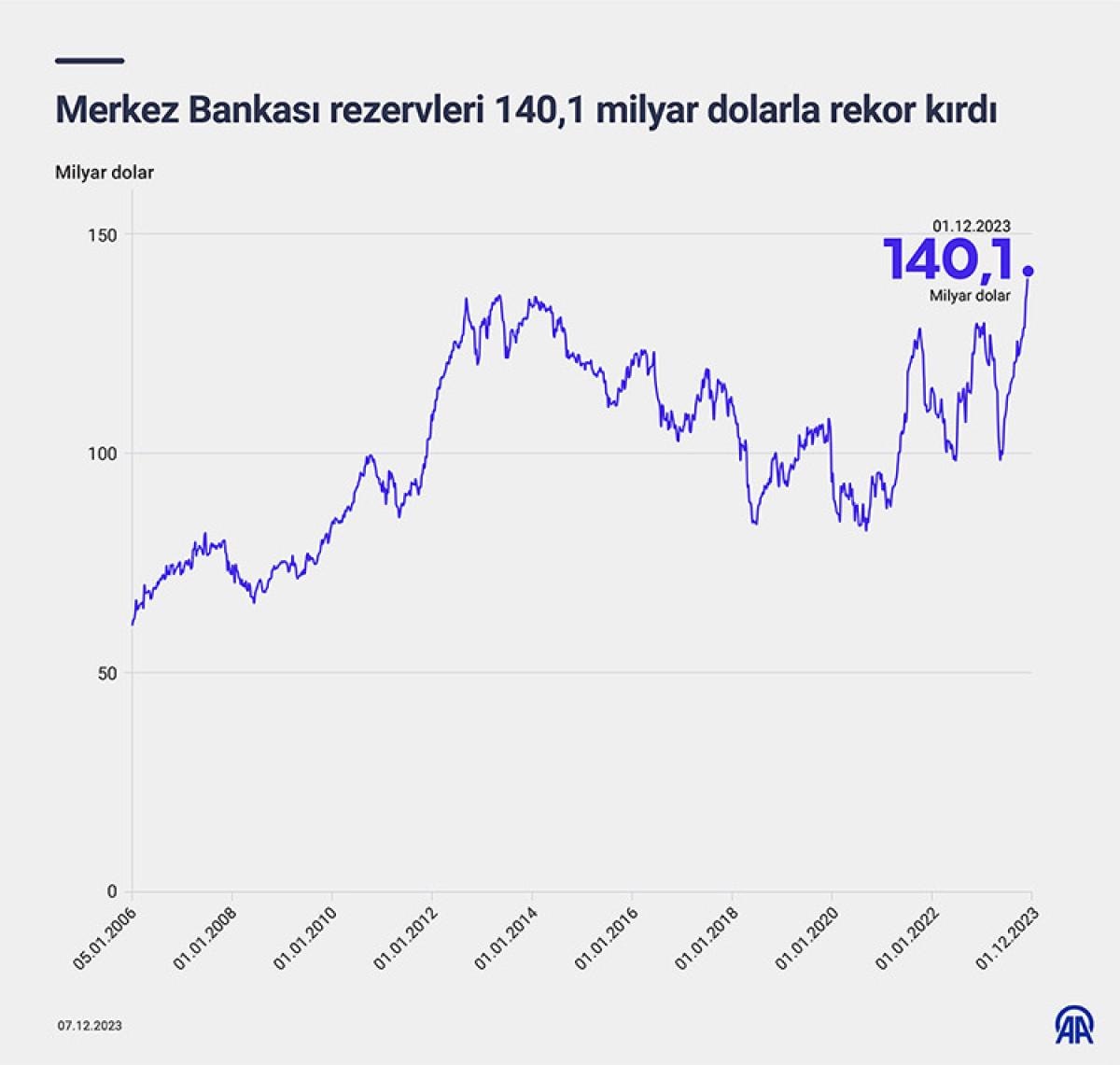 Türkiye Cumhuriyet Merkez Bankası (TCMB) rezervleri, mayıs sonundan bu yana yürütülen politikalarla 41,7 milyar dolar artarak 140 milyar 149 milyon dolara çıktı ve böylece tüm zamanların en yüksek seviyesine yükseldi.