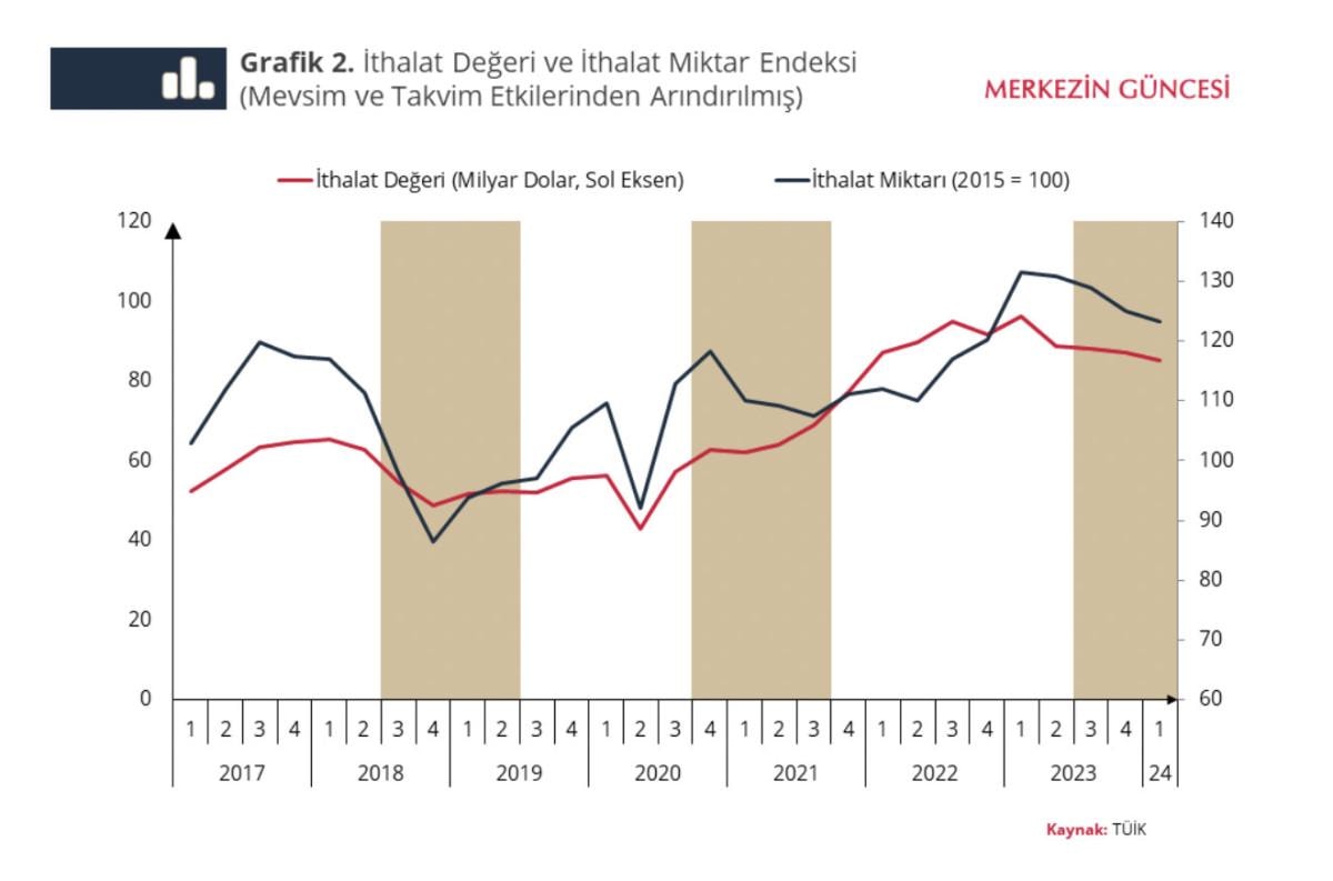 İthalat tarafında ise parasal sıkılaşmanın talebi kısıtlayıcı etkilerinin görülmesiyle birlikte, 2023 yılının ikinci yarısından 2024 yılının ilk çeyreğine uzanan süreçte nominal ve reel ithalatın beklendiği üzere belirgin biçimde azaldığı görülüyor.