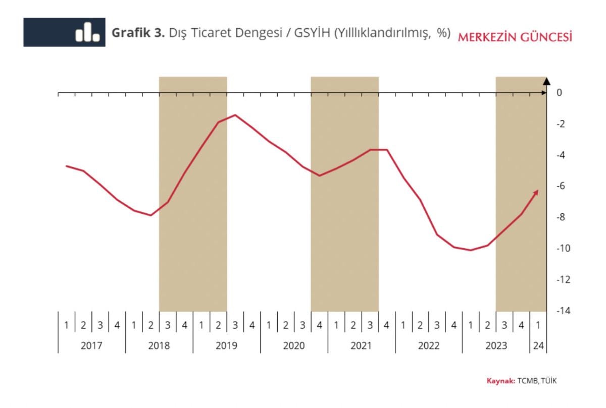Bu bağlamda veriler, ilgili sıkılaştırma dönemlerinde dış ticaret dengesinde milli gelire oran olarak belirgin bir iyileşme yaşandığını ortaya koyuyor.