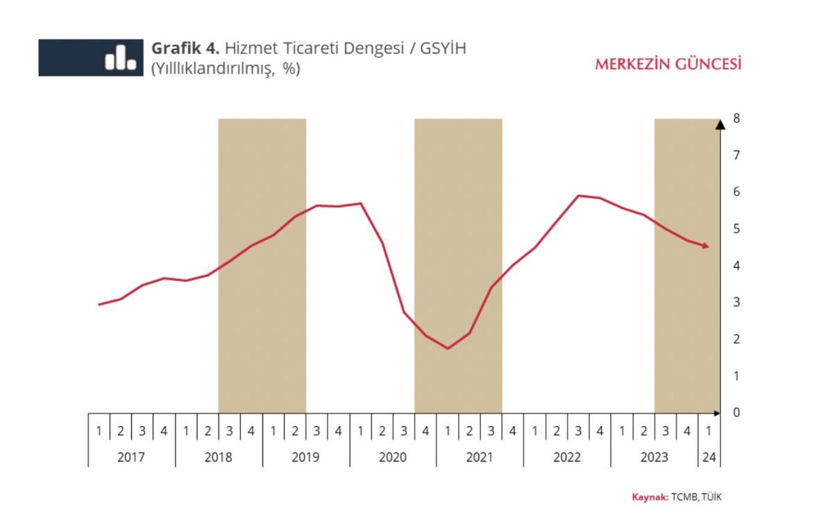 Dış ticaret dengesi cari dengenin önemli bir kısmını oluşturduğundan, parasal sıkılaştırma dönemlerinde dış ticaret dengesinde görülen bu türden somut bir iyileşme cari dengeye de büyük ölçüde yansıyacak. Öte yandan, cari dengenin diğer bir önemli alt bileşeni olan hizmet ticaretinin seyri de bu dönemlerde cari dengede beklenen iyileşmenin düzeyinde belirleyici bir unsurdur. Nitekim referans olarak aldığımız ve iç talebin kısıtlandığı iki parasal sıkılaştırma döneminde, turizm gelirlerinin sürüklediği hizmetler dengesi, cari dengedeki iyileşmeye önemli katkı sunmuştu. Son sıkılaştırma dönemini içeren 2023 yılının ikinci yarısında ise hizmetler dengesi güçlü görünümünü sürdürmekle birlikte milli gelire oranla bir miktar gerilemiş.