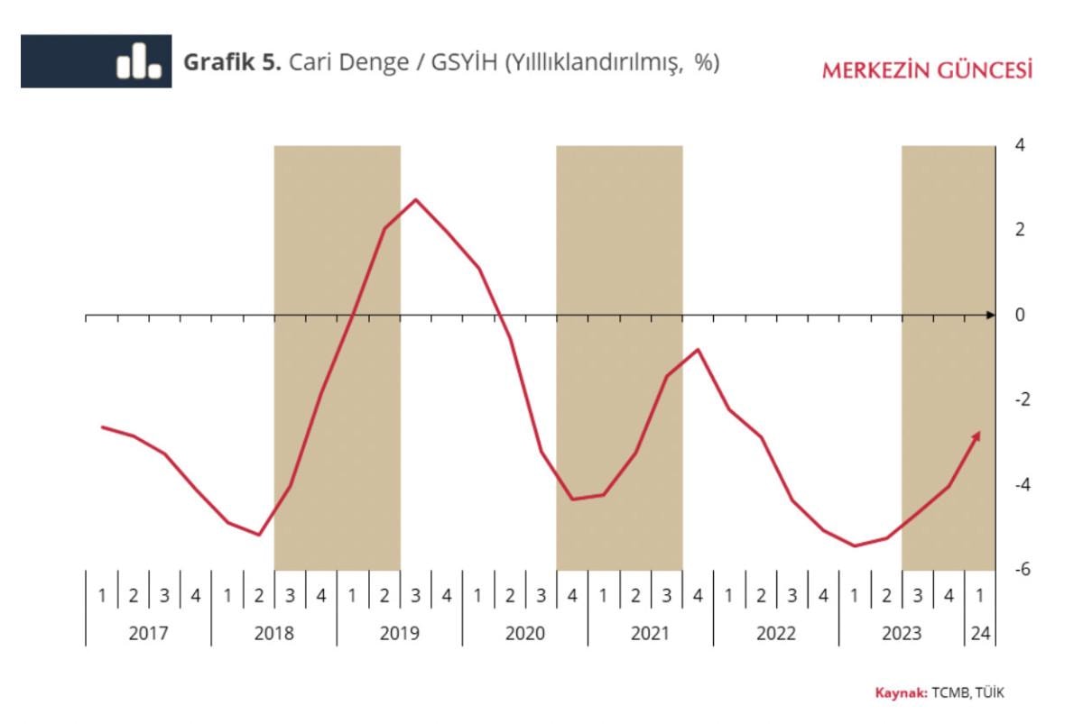 2024 yılının ikinci yarısında, parasal aktarımın gecikmeli etkilerinin devreye girmesiyle, iç talepte belirginleşen dengelenme ile birlikte cari dengedeki iyileşmenin devam edeceğini öngörüyoruz. Burada, reel kurda beklenen değerlenmenin cari denge üzerindeki olumsuz etkisinin, iç talepteki dengelenme neticesinde fazlasıyla telafi edileceğini tahmin ediyoruz.