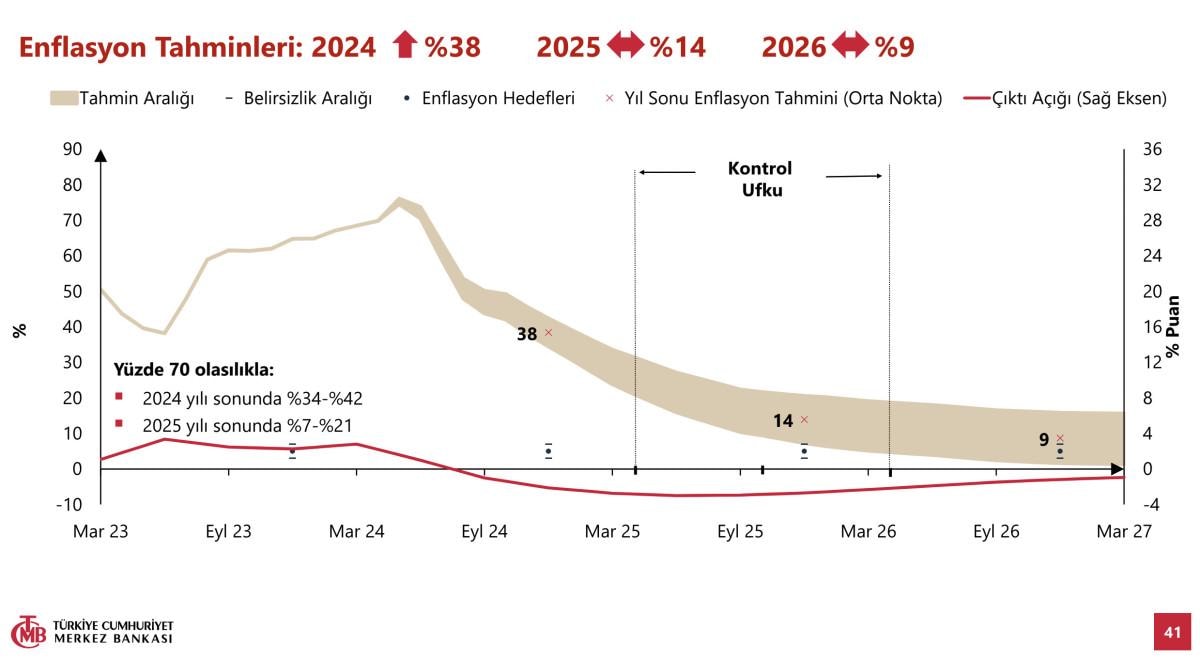 TCMB, yılın birinci Enflasyon Raporu toplantısında 2024 yıl sonu enflasyon tahminini yüzde 36, 2025 yıl sonu tahminini yüzde 14 ve 2026 yıl sonu tahminini de yüzde 9 olarak bir önceki rapordaki haliyle korumuştu.
