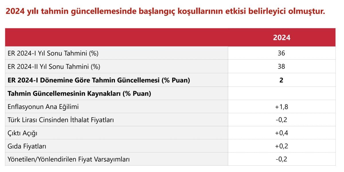 2024 yıl sonu enflasyon tahminini yüzde 38’e güncellendi. 2025 ve 2026 tahminlerini sırasıyla yüzde 14 ve yüzde 9 seviyesinde korundu. Orta vadede ise enflasyonun yüzde 5’te istikrar kazanmasını hedeflendi.