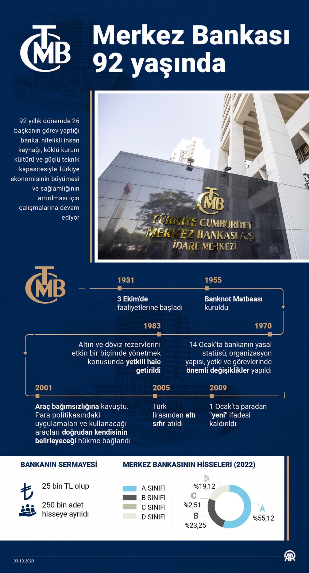 Farklı kurum ve kuruluşlar tarafından yürütülen işlevlerin tek elde toplanmasının ardından 3 Ekim 1931'de faaliyetlerine başlayan Türkiye Cumhuriyet Merkez Bankası (TCMB), bugün 92. kuruluş yıl dönümünü kutluyor.