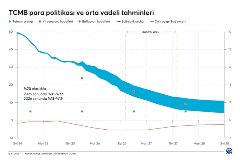 Türkiye Cumhuriyet Merkez Bankası (TCMB), Başkan Fatih Karahan'ın İstanbul'da sunumunu gerçekleştirdiği orta vadeli tahminlerindeki ara hedeflere ilişkin infografik yayımladı.