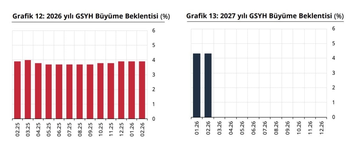 Katılımcıların GSYH 2026 ve 2027 yılı büyüme beklentileri, bir önceki anket döneminde olduğu gibi bu anket döneminde de sırasıyla yüzde 3,9 ve 4,3 olarak gerçekleşti.