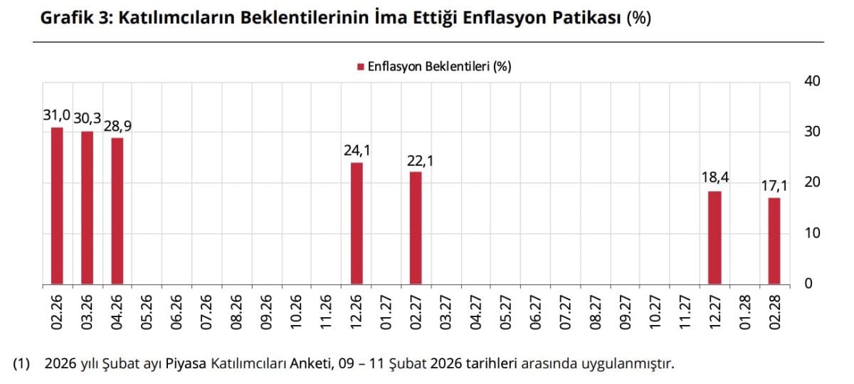 - Türkiye Cumhuriyet Merkez Bankası'nın Şubat 2025 anketine göre, katılımcıların yıl sonu TÜFE beklentisi yüzde 24,11'e yükselirken, döviz kuru beklentisi 51,09 TL'ye geriledi.