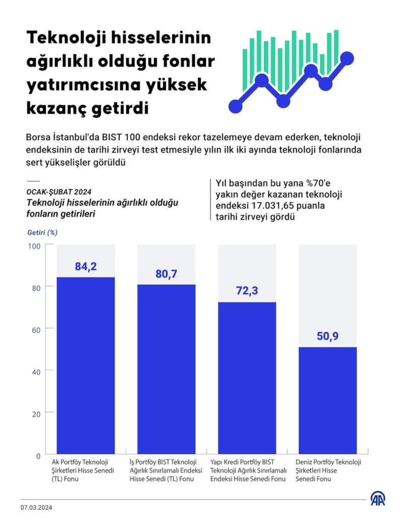 Borsa İstanbul'da BIST 100 endeksi, rekor tazelemeye devam ederken, teknoloji endeksinin de BIST 100 endeksi eşliğinde tarihi zirveyi test etmesiyle yılın ilk iki ayında teknoloji fonlarında sert yükselişler görüldü.
