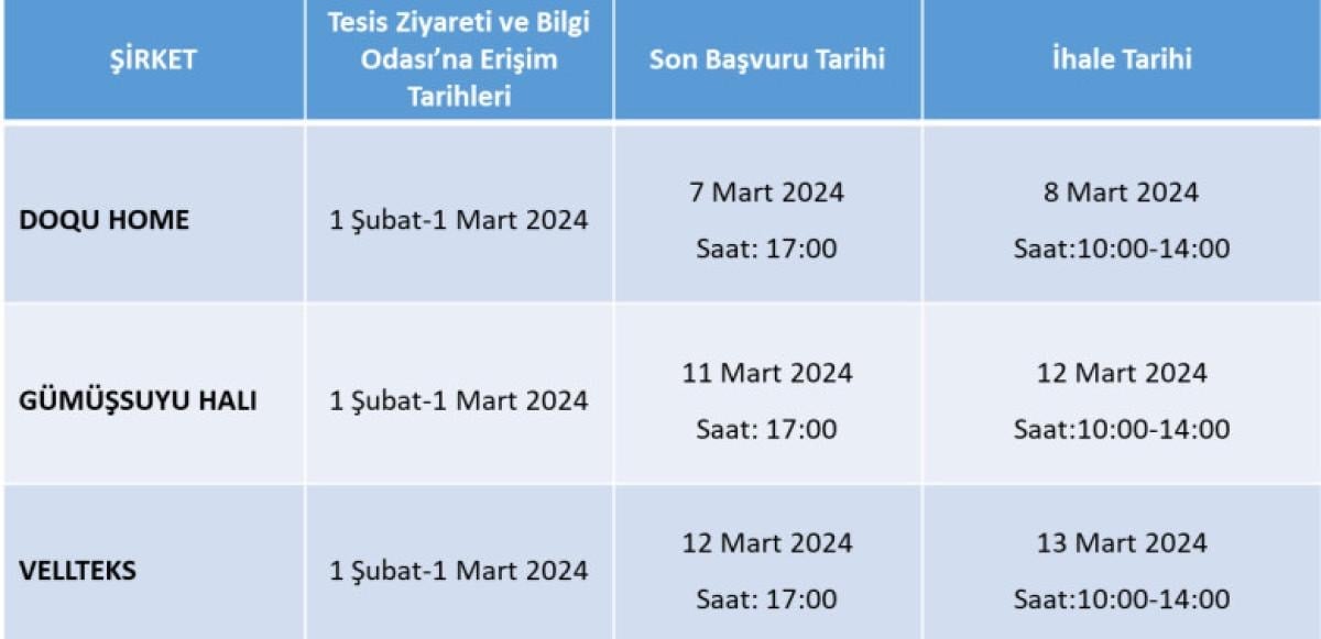 Yatırımcılar düzenlenen ihalelere teklif vermeden önce satış ilanında yer alan koşulları sağladıkları takdirde, belirlenen tarihlerde üretim tesislerini gezebilecek ve elektronik ortamda sunulacak olan Bilgi Odası’ndan şirketlere ilişkin detaylı bilgilere erişim imkânı bulacak.