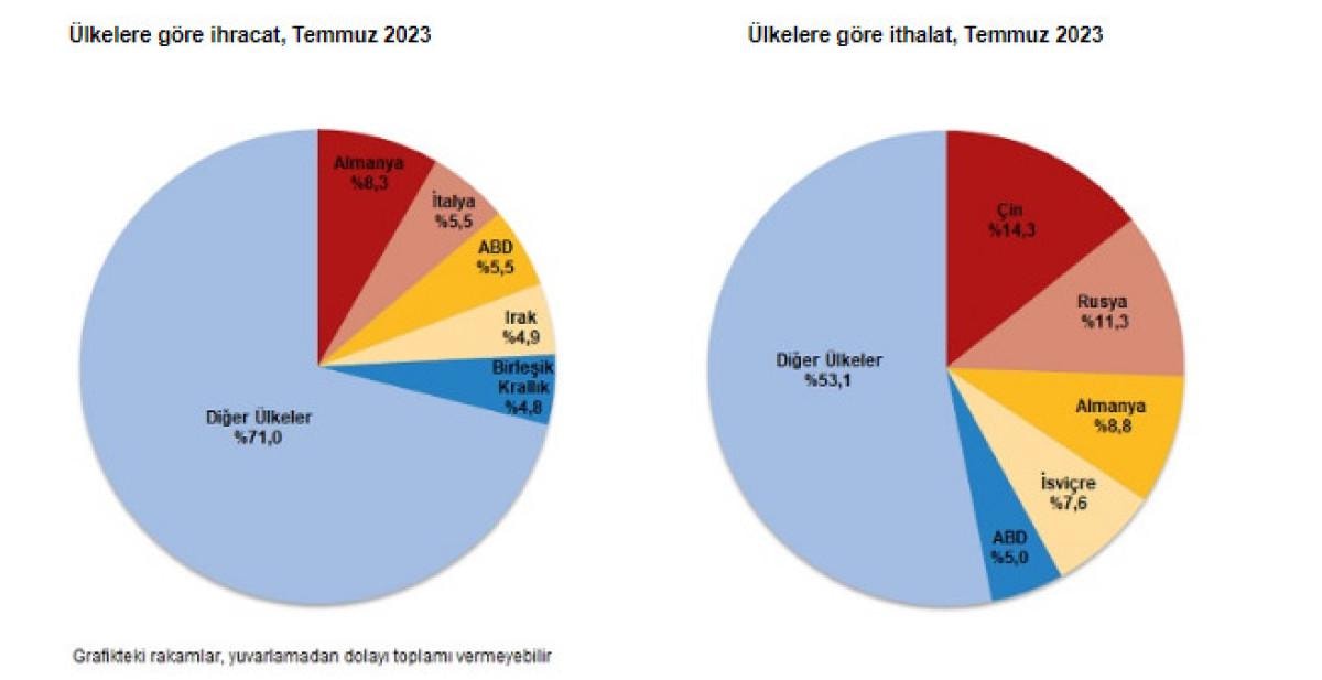 İthalatta Çin ilk sırayı aldı. Temmuz ayında Çin'den yapılan ithalat 4 milyar 603 milyon dolar olurken, bu ülkeyi sırasıyla; 3 milyar 650 milyon dolar ile Rusya Federasyonu, 2 milyar 839 milyon dolar ile Almanya, 2 milyar 458 milyon dolar ile İsviçre, 1 milyar 602 milyon dolar ile ABD izledi. İlk 5 ülkeden yapılan ithalat, toplam ithalatın yüzde 46,9'unu oluşturdu.