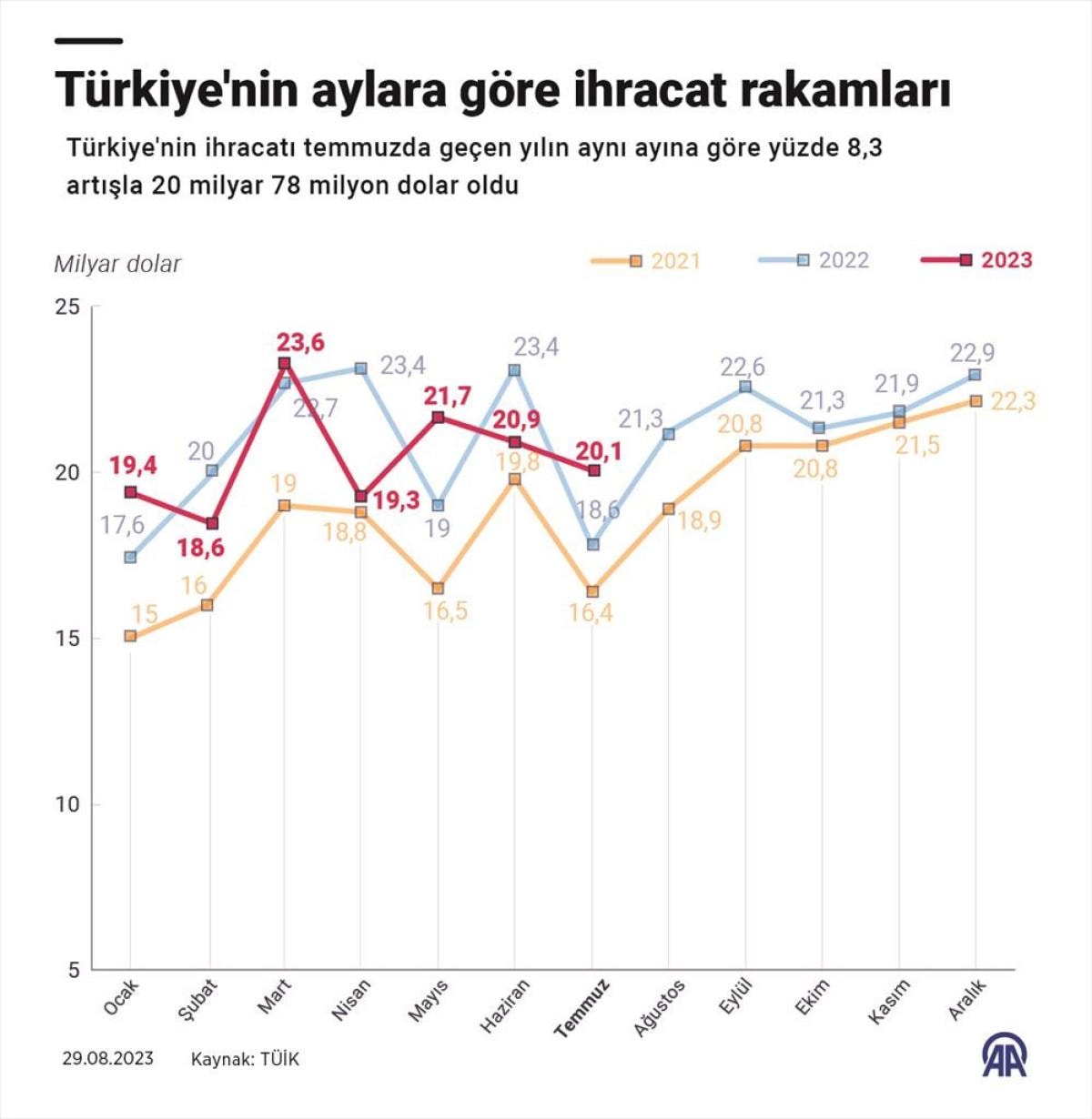 Enerji ürünleri ve parasal olmayan altın hariç ihracat, 2023 Temmuz ayında yüzde 9,9 artarak 16 milyar 821 milyon dolardan, 18 milyar 485 milyon dolara yükseldi.