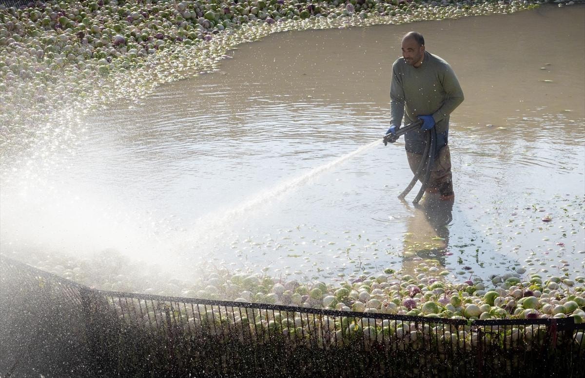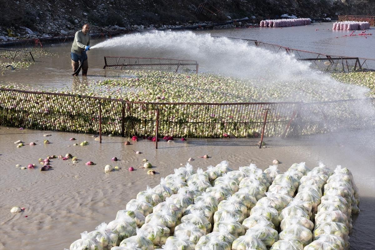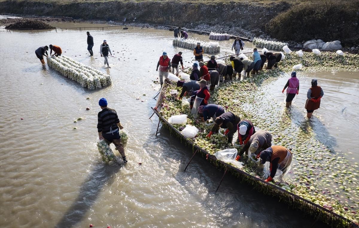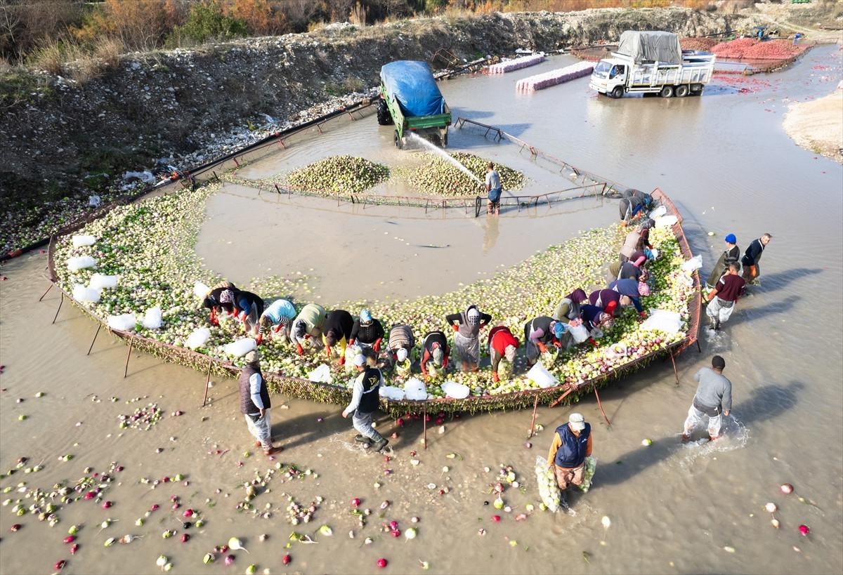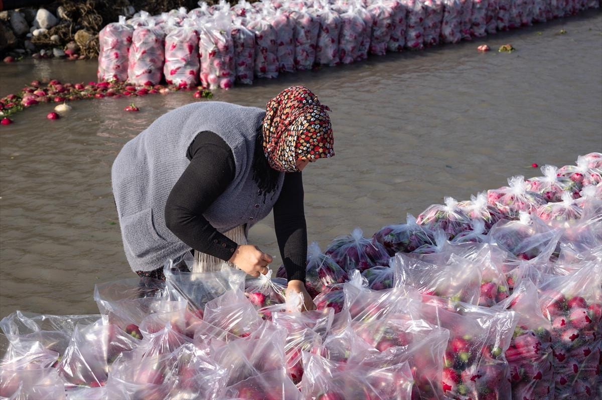 Kış aylarına girilmesiyle başlayan hasat döneminde işçiler, sabahın erken saatlerinde Savrun Çayı'na gelerek turpları yıkayıp paketliyor.