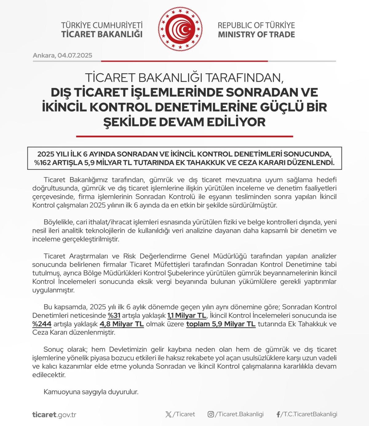 Bakanlıktan yapılan yazılı açıklamada, "Ticaret Bakanlığımız tarafından, gümrük ve dış ticaret mevzuatına uyum sağlama hedefi doğrultusunda, gümrük ve dış ticaret işlemlerine ilişkin yürütülen inceleme ve denetim faaliyetleri çerçevesinde, firma işlemlerinin sonradan kontrolü ile eşyanın tesliminden sonra yapılan ikincil kontrol çalışmaları 2025 yılının ilk 6 ayında da en etkin bir şekilde sürdürülmüştür. Böylelikle, cari ithalat/ihracat işlemleri esnasında yürütülen fiziki ve belge kontrolleri dışında, yeni nesil ileri analitik teknolojilerin de kullanıldığı veri analizine dayanan daha kapsamlı bir denetim ve inceleme gerçekleştirilmiştir." denildi.