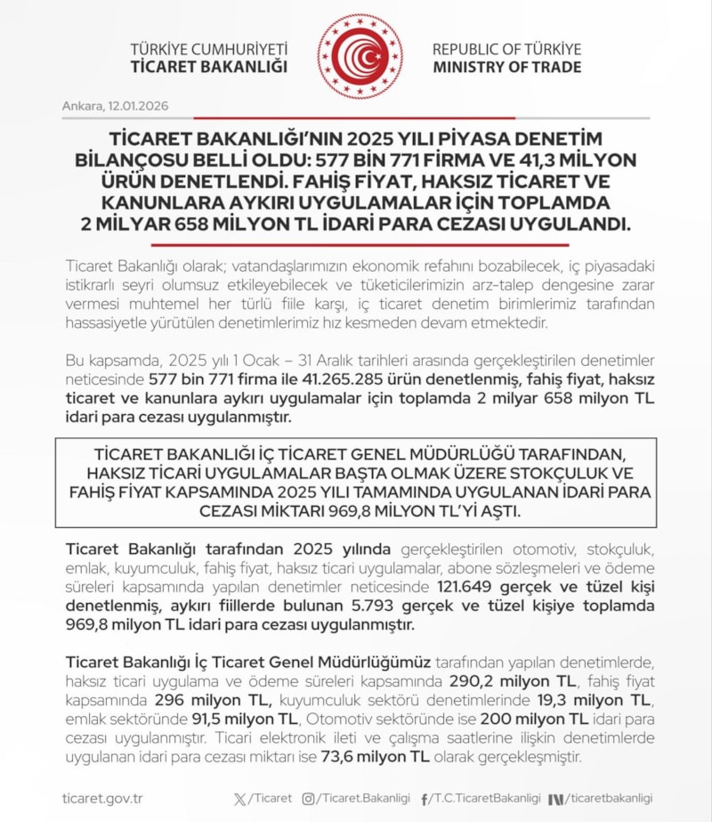 Vatandaşların ekonomik refahını bozabilecek, iç piyasadaki istikrarlı seyri olumsuz etkileyebilecek ve tüketicilerin arz-talep dengesine zarar vermesi muhtemel her türlü fiile karşı, iç ticaret birimlerince yürütülen denetimlerin devam ettiği belirtilen açıklamada, "Bu kapsamda, 2025 yılı 1 Ocak-31 Aralık tarihlerinde 577 bin 771 firma ile 41 milyon 265 bin 285 ürün denetlendi. Fahiş fiyat, haksız ticaret ve kanunlara aykırı uygulamalar için 2 milyar 658 milyon lira idari para cezası uygulandı." ifadeleri kullanıldı.