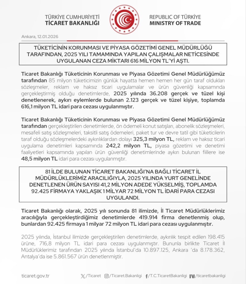 Açıklamada, 2025 yılı sonunda 81 ilde il ticaret müdürlükleri aracılığıyla 419 bin 914 firmanın denetlendiği, bunlardan 92 bin 425 firmaya 1 milyar 72 milyon lira idari para cezası uygulandığı belirtilerek, "2025 yılında, İstanbul'da gerçekleştirilen denetimlerde, aykırılık tespit edilen 198 bin 415 ürüne, 716,8 milyon lira idari para cezası uygulandı. Bununla birlikte il müdürlüklerimiz tarafından 2025'te İstanbul'da 10 milyon 897 bin 125, Ankara'da 8 milyon 178 bin 362, Antalya'da ise 5 milyon 861 bin 567 ürün denetlendi." ifadelerine yer verildi.