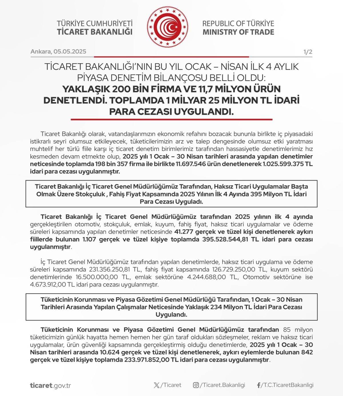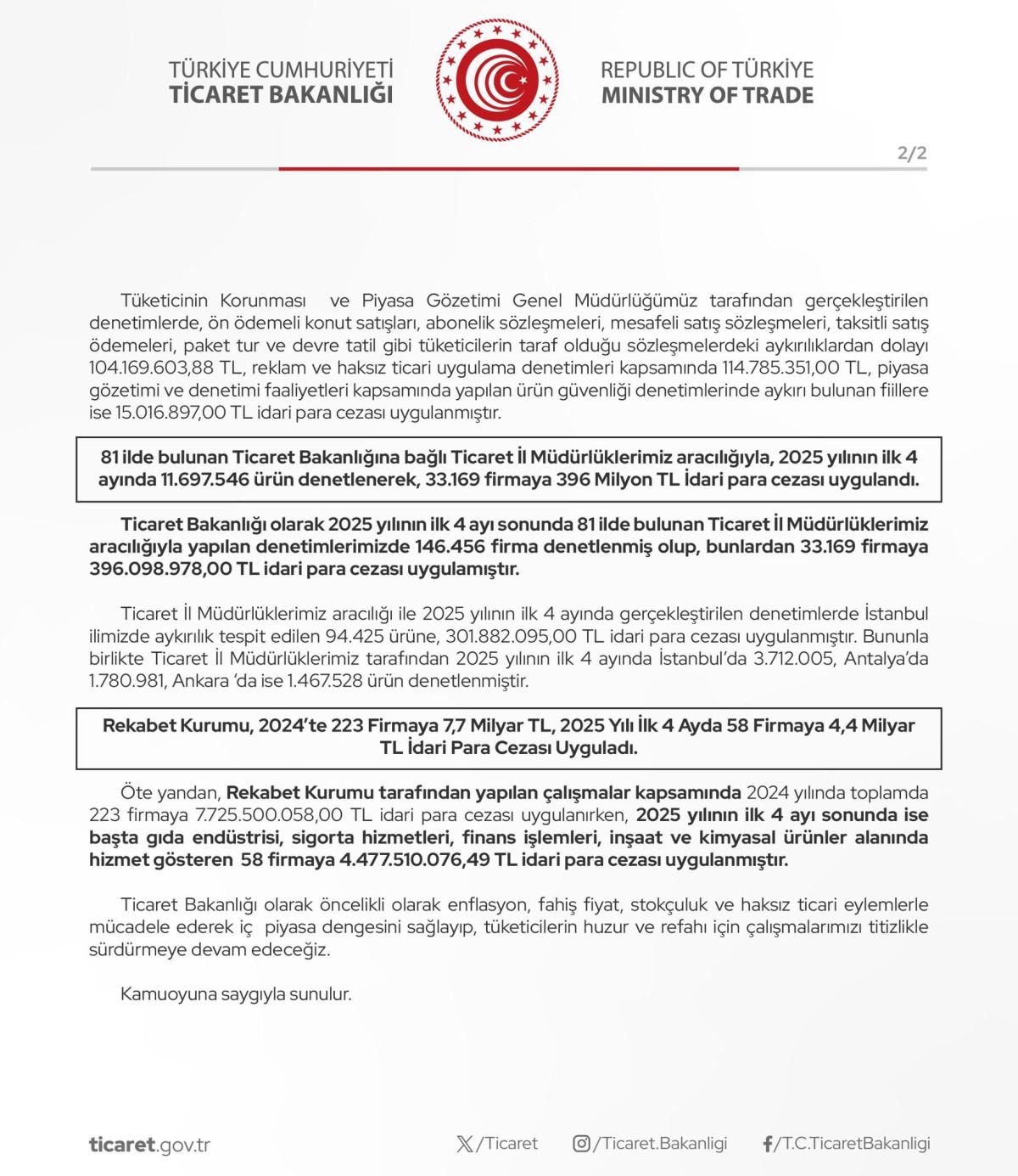 Ticaret Bakanlığı, 2025 yılının ilk 4 ayı sonunda 81 ilde bulunan Ticaret İl Müdürlükleri aracılığıyla yapılan denetimlerde 146 bin 456 firmayı denetledi. Bunlardan 33 bin 169 firmaya 396 milyon 98 bin 978 lira idari para cezası uygulandı.