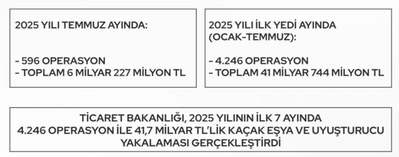 Ticaret Bakanlığı, 2025 yılının ilk 7 ayında 41,7 milyar TL'lik kaçak eşya ve uyuşturucu yakalaması gerçekleştirildiğini duyurdu.