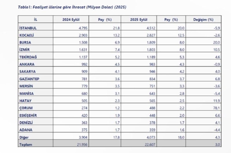2025 yılı eylül ayında geçen yılın aynı ayına göre faaliyet illeri bazında ihracatta en fazla artış incelendiğinde sırasıyla;