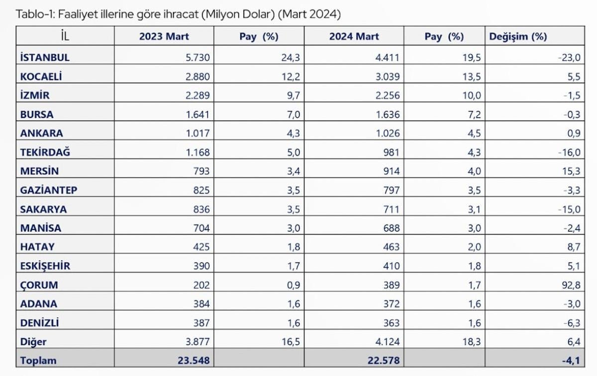 2024 yılı mart ayında geçen yılın aynı ayına göre faaliyet illeri bazında ihracatta İstanbul yüzde 23 azalış ve 4 milyar 410 milyon dolarla birinci sırada yer aldı.