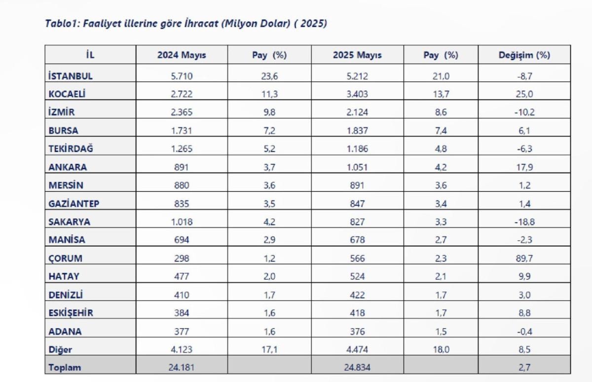 2025 yılı Mayıs ayında geçen yılın aynı ayına göre faaliyet illeri bazında ihracatta en fazla artış incelendiğinde sırasıyla;