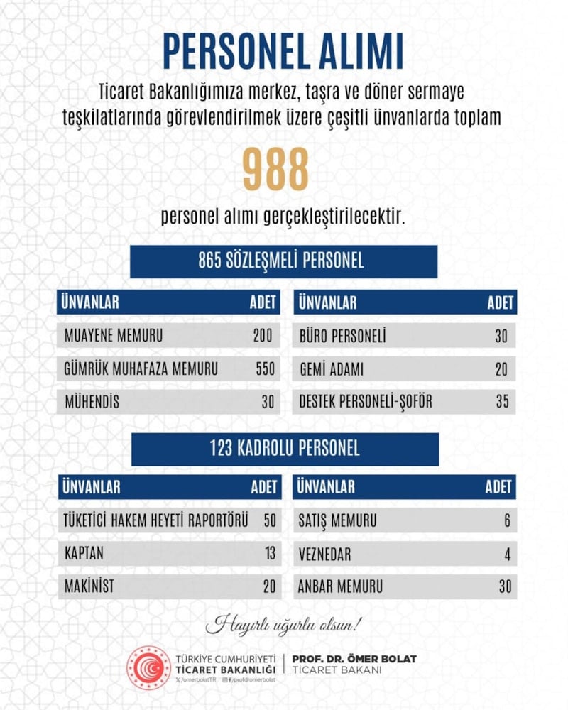 Ticaret Bakanlığı; merkez, taşra ve döner sermaye teşkilatlarında görevlendirmek üzere yapacağı 988 yeni personel alımı ile ilgili bilgi verdi.