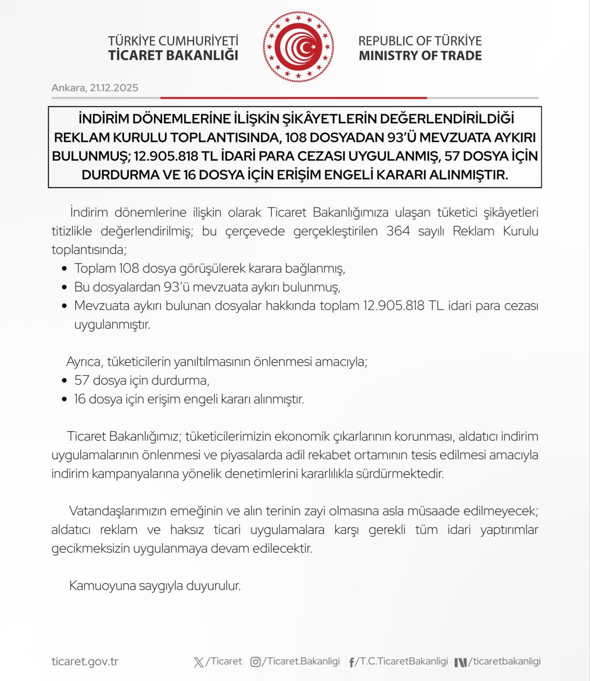 Ticaret Bakanlığımız, tüketicilerin ekonomik çıkarlarının korunması, aldatıcı indirim uygulamalarının önlenmesi ve piyasalarda adil rekabet ortamının tesis edilmesi amacıyla indirim kampanyalarına yönelik denetimlerini kararlılıkla sürdürmektedir. Vatandaşlarımızın emeğinin ve alın terinin zayi olmasına asla müsaade edilmeyecek, aldatıcı reklam ve haksız ticari uygulamalara karşı gerekli tüm idari yaptırımlar gecikmeksizin uygulanmaya devam edilecektir.