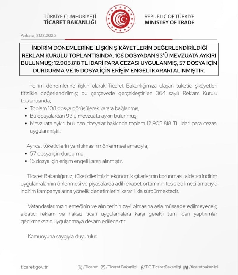 Ticaret Bakanlığı, Kasım indirim dönemine yönelik şikayetlerin ele alındığı Reklam Kurulu toplantısında 12 milyon 905 bin 818 TL idari para cezası uygulandığını duyurdu.