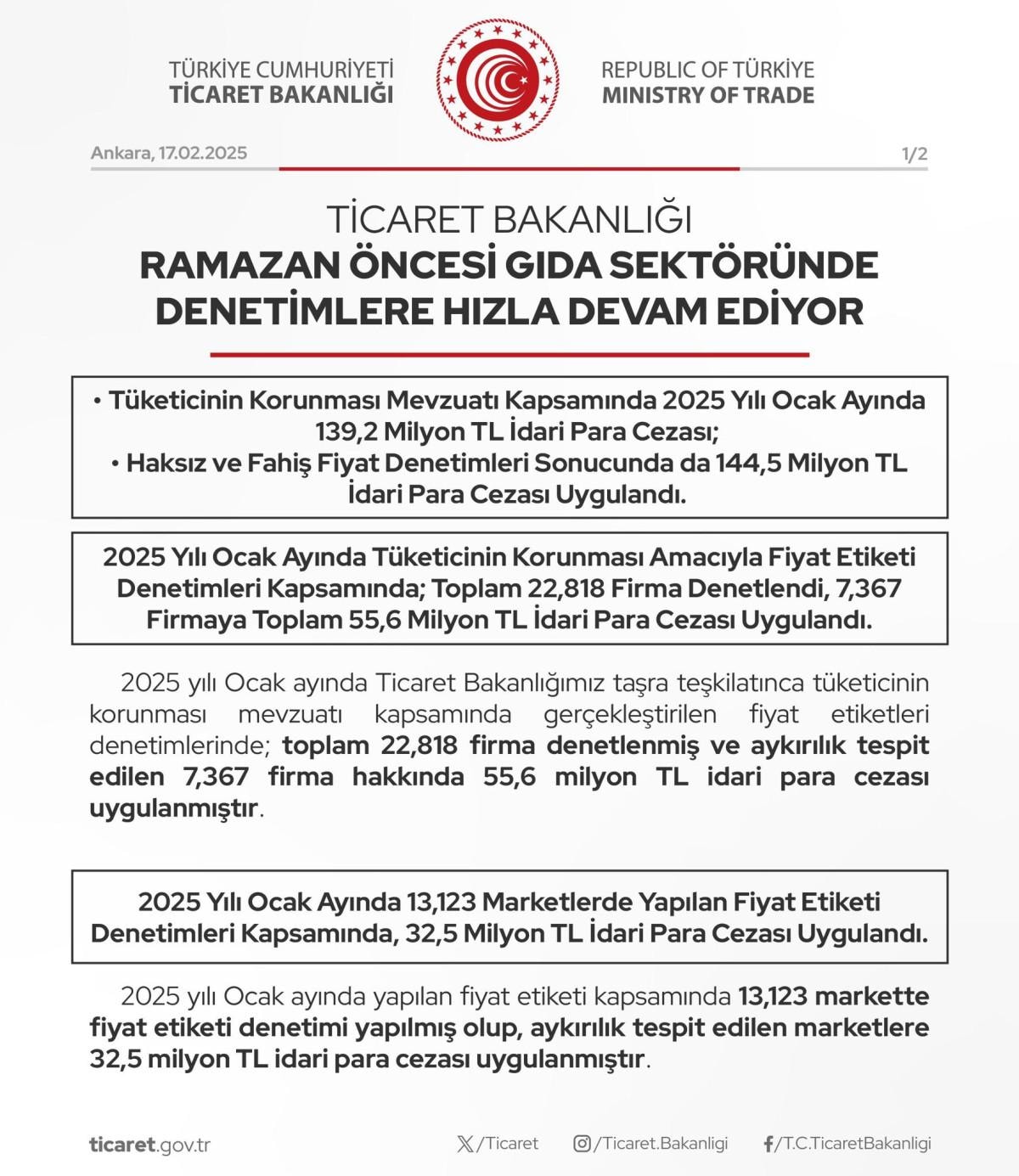 2025 yılı Ocak ayında Ticaret Bakanlığı taşra teşkilatınca tüketicinin korunması mevzuatı kapsamında gerçekleştirilen fiyat etiketleri denetimlerinde; toplam 22 bin 818 firma denetlendi ve aykırılık tespit edilen 7 bin 367 firma hakkında 55,6 milyon TL idari para cezası uygulandı.