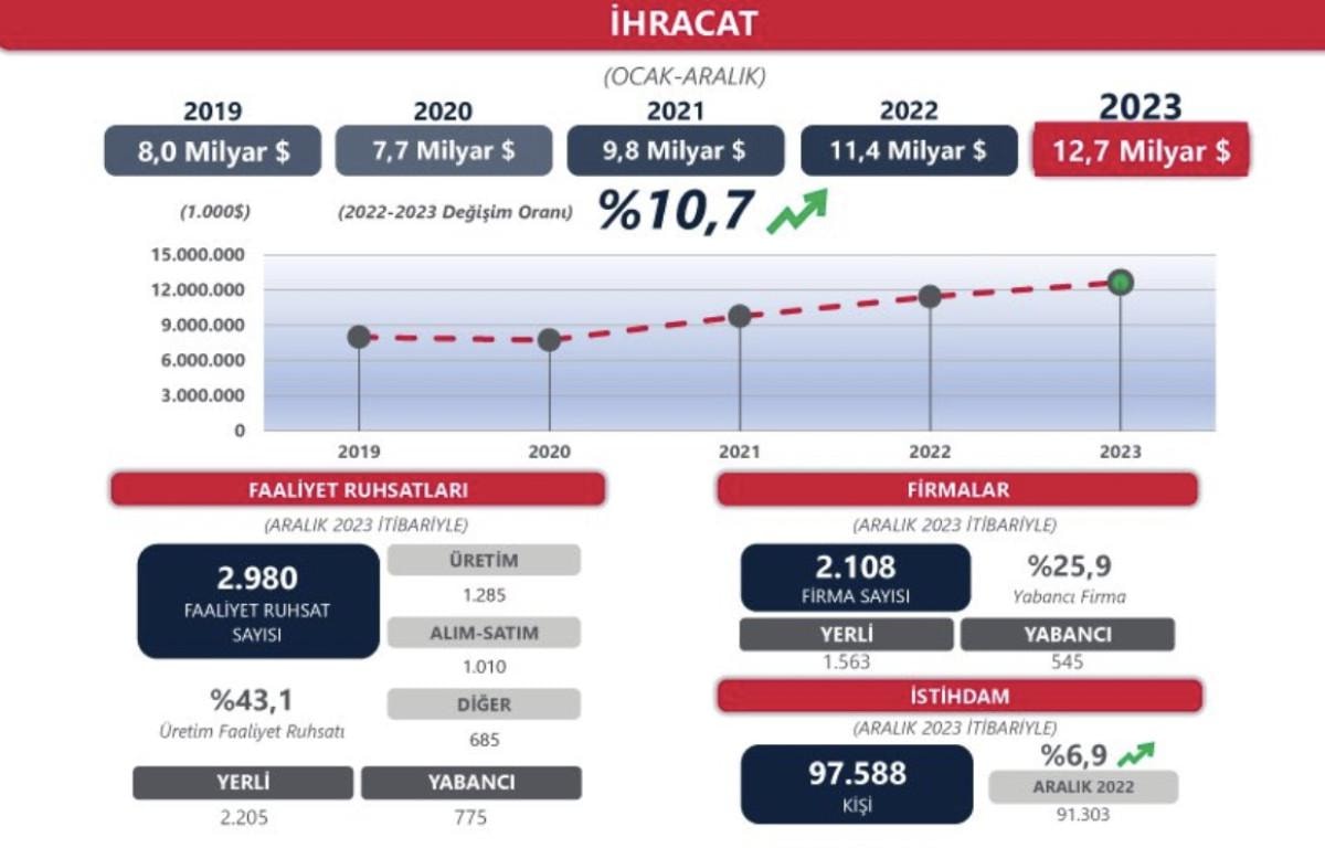 Serbest bölgelerde 2023 yılında ihracat yüzde 10,7 artarak 12,7 milyar dolara ulaştı.