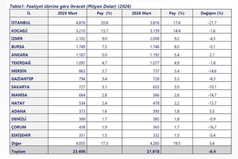 2026 yılı Mart ayında, İstanbul, Kocaeli, İzmir, Bursa ve Ankara ihracatta ilk beşte yer alan iller olurken; Tekirdağ, Mersin, Gaziantep, Sakarya ve Manisa ikinci beşte yer aldı.