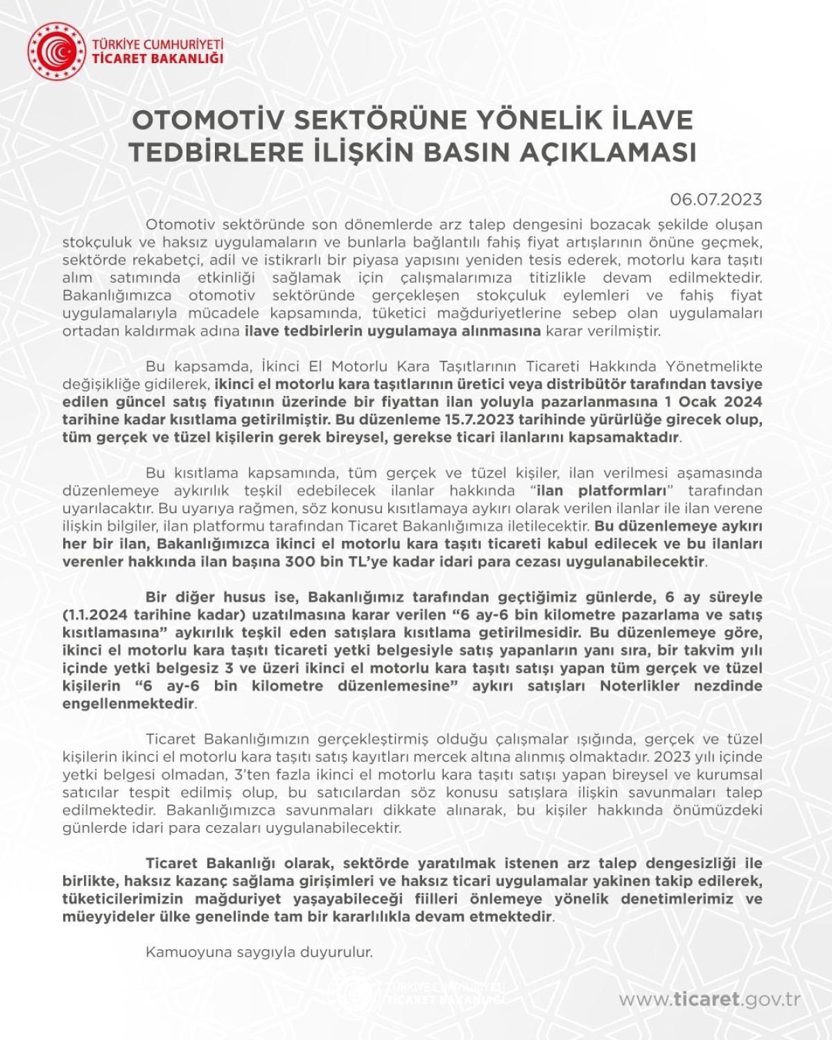 Ticaret Bakanlığı ayrıca açıklamasında, gerçek ve tüzel kişilerin ikinci el motorlu kara taşıtı satışlarının mercek altına alındığını da aktararak şu bilgiyi paylaştı: