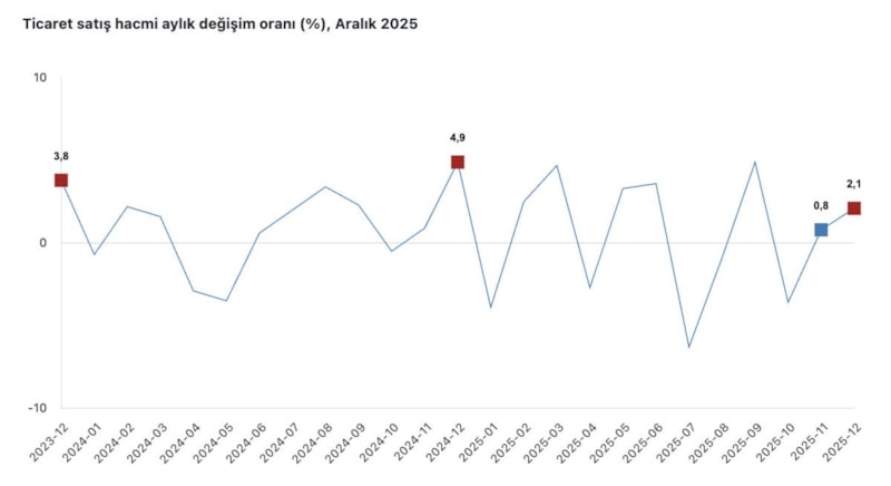 Buna göre, ticaret satış hacmi Aralık 2025'te, bir önceki aya kıyasla yüzde 2,1 artış gösterdi.