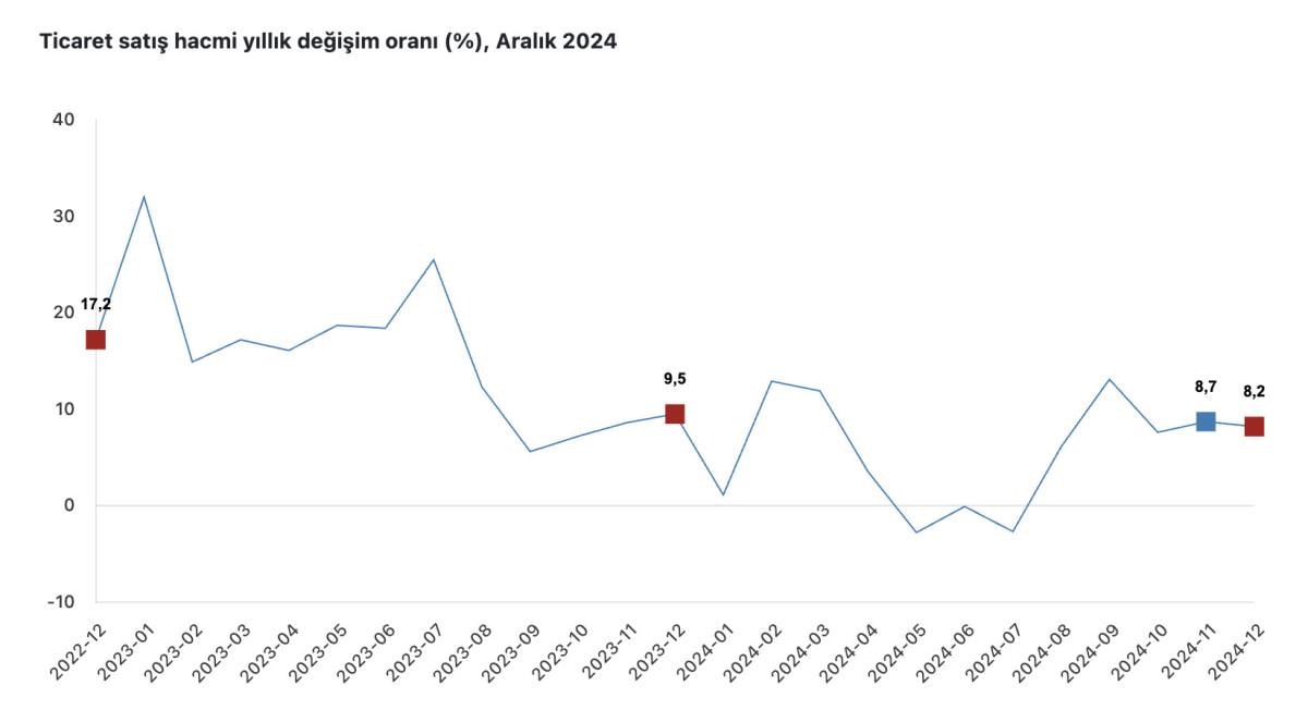 Ticaret satış hacmi, Aralık 2024'te bir önceki yılın aynı ayına göre yüzde 8,2 artış gösterdi. Aynı dönemde motorlu kara taşıtları ve motosikletlerin toptan ve perakende ticareti ile onarımı için satış hacmi yüzde 5,1, toptan ticaret satış hacmi yüzde 6,7 ve perakende ticaret satış hacmi yüzde 13,5 yükseldi.