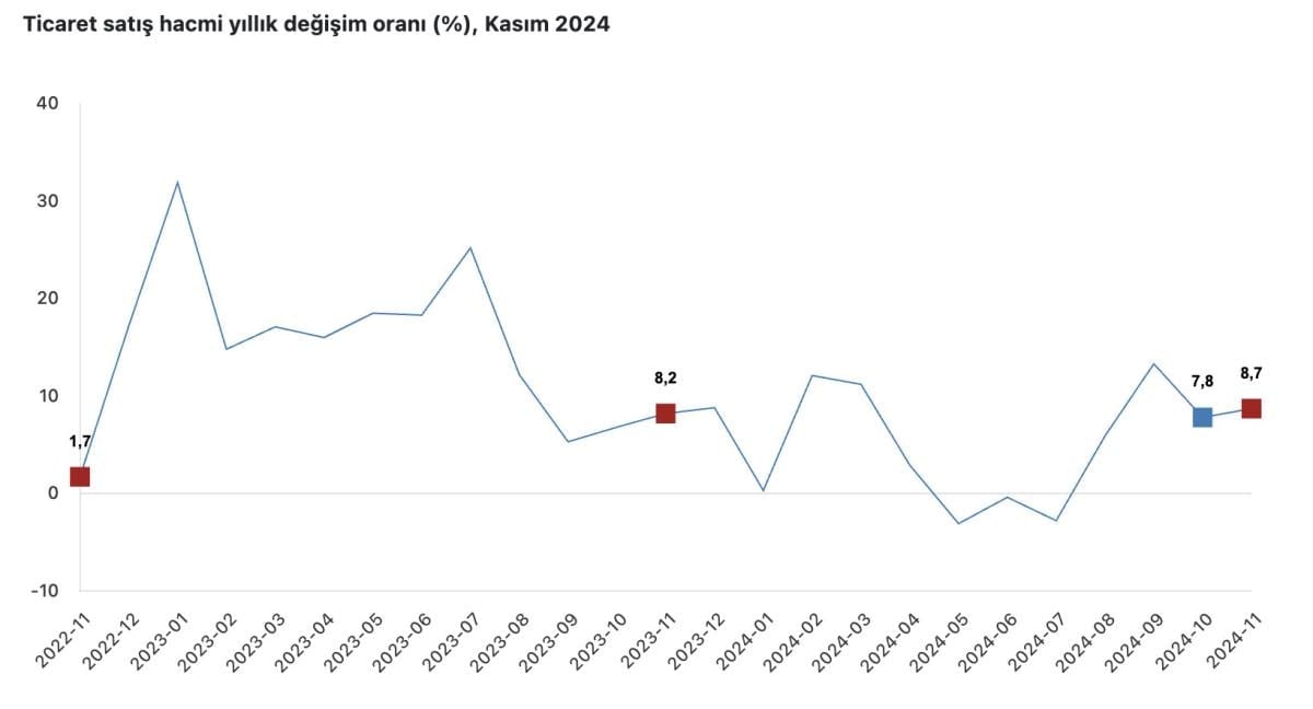 Ticaret satış hacmi, Kasım 2024'te bir önceki yılın aynı ayına göre yüzde 8,7 artış gösterdi.