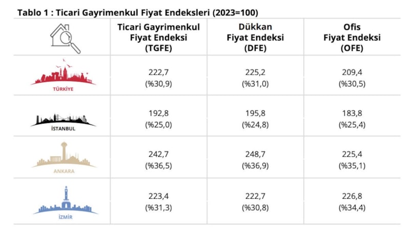 2025 yılı dördüncü çeyreğinde Türkiye genelinde, bir önceki çeyreğe göre yüzde 8,1 oranında artan Ticari Gayrimenkul Fiyat Endeksi, bir önceki yılın aynı çeyreğine göre nominal olarak yüzde 30,9 oranında arttı.