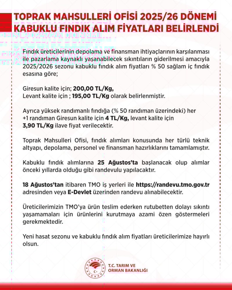 Tarım ve Orman Bakanlığı’na bağlı Toprak Mahsulleri Ofisi (TMO), 2025 yılı kabuklu fındık alım fiyatının Giresun kalite için 200,00 TL/Kg, Levant kalite için ise 195,00 TL/Kg olarak belirlendiğini açıkladı.