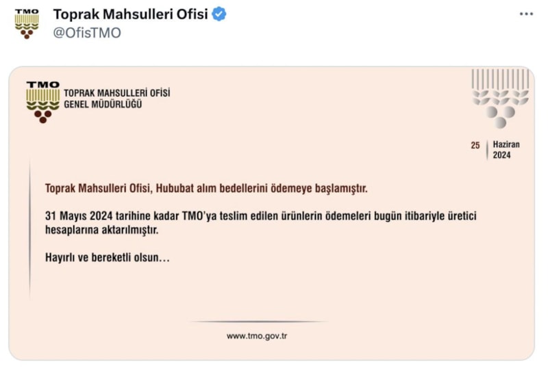 TMO, sosyal medya hesabından bir açıklama yaparak hububat alım ödemelerine ilişkin bilgi paylaştı.