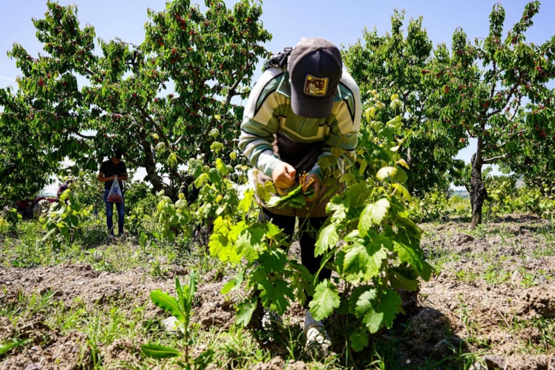 Çiftçiler, sabahın erken saatlerinde başladıkları hasat işinde, üzüm yapraklarını tek tek toplayarak özenle istifliyor.