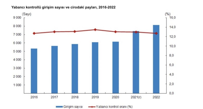 Yabancı kontrollü girişim istatistiklerine göre, yabancı kontrolündeki girişim sayısı 2021 yılında 7 bin 424 ve 2022 yılında 8 bin 134 oldu.