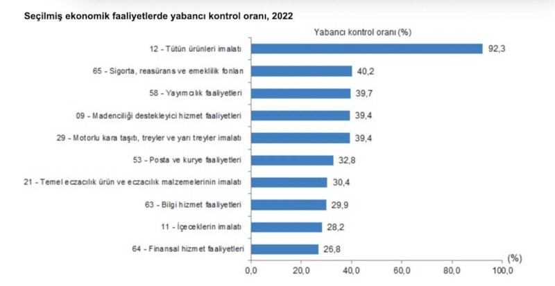 Tütün ürünleri imalatı, 2022 yılında yabancı kontrollü girişimlerin ciro payının yüzde 92,3 ile en yüksek olduğu faaliyet oldu. Yabancı kontrollü girişimlerin ciro payının en yüksek olduğu ikinci faaliyet ise yüzde 40,2 ile sigorta, reasürans ve emeklilik fonları oldu.