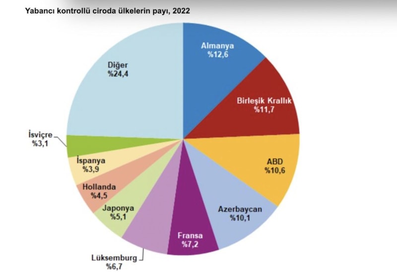 Yabancı kontrollü 8 bin 134 girişimden bin 131 tanesi Almanya tarafından kontrol edildi. Almanya tarafından kontrol edilen girişimlerin 2022 yılında elde ettiği cironun toplam yabancı kontrollü cirodaki payı yüzde 12,6 oldu. Birleşik Krallık kontrolündeki 627 girişimin toplam yabancı kontrollü cirodaki payı yüzde 11,7 iken ABD kontrolündeki 876 girişimin yabancı kontrollü cirodaki payı ise yüzde 10,6 olarak gerçekleşti.