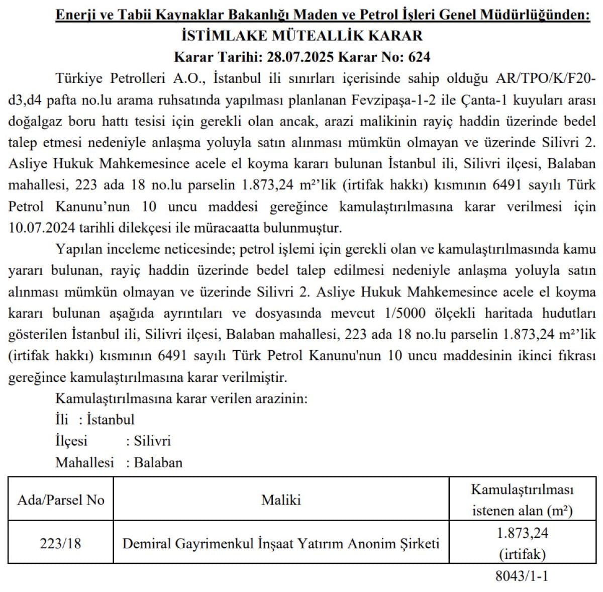 Türkiye Petrolleri Anonim Ortaklığı'nın (TPAO) başvurusu üzerine, İstanbul'daki sahasına ilişkin kamulaştırma kararı alındı.