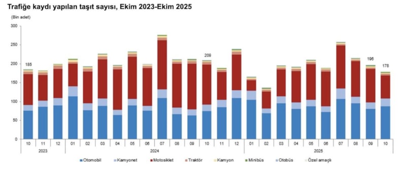 TÜİK, Ekim 2025 tarihli Motorlu Kara Taşıtları verilerini paylaştı. Buna göre ekim ayında Türkiye genelinde 178 bin 481 adet taşıtın trafiğe kaydı yapıldı.