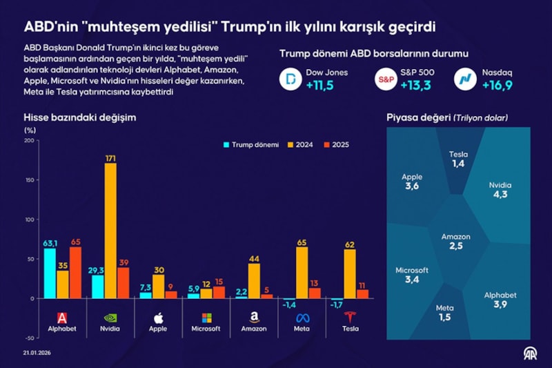 ABD Başkanı Donald Trump'ın ikinci kez bu göreve başlamasının ardından geçen bir yılda, "muhteşem yedili" olarak adlandırılan teknoloji devleri Alphabet, Amazon, Apple, Microsoft ve Nvidia'nın hisseleri değer kazanırken Meta ile Tesla yatırımcısına kaybettirdi.