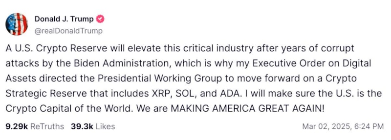 Bu nedenle dijital varlıklara ilişkin başkanlık kararnamesinin, Başkanlık Çalışma Grubu'na XRP, SOL ve ADA'yı içeren bir stratejik kripto rezervi üzerinde ilerleme talimatı verdiğini kaydeden Trump, "ABD'nin dünyanın kripto başkenti olmasını sağlayacağım. Amerika'yı yeniden büyük yapacağız." ifadelerini kullanmıştı.